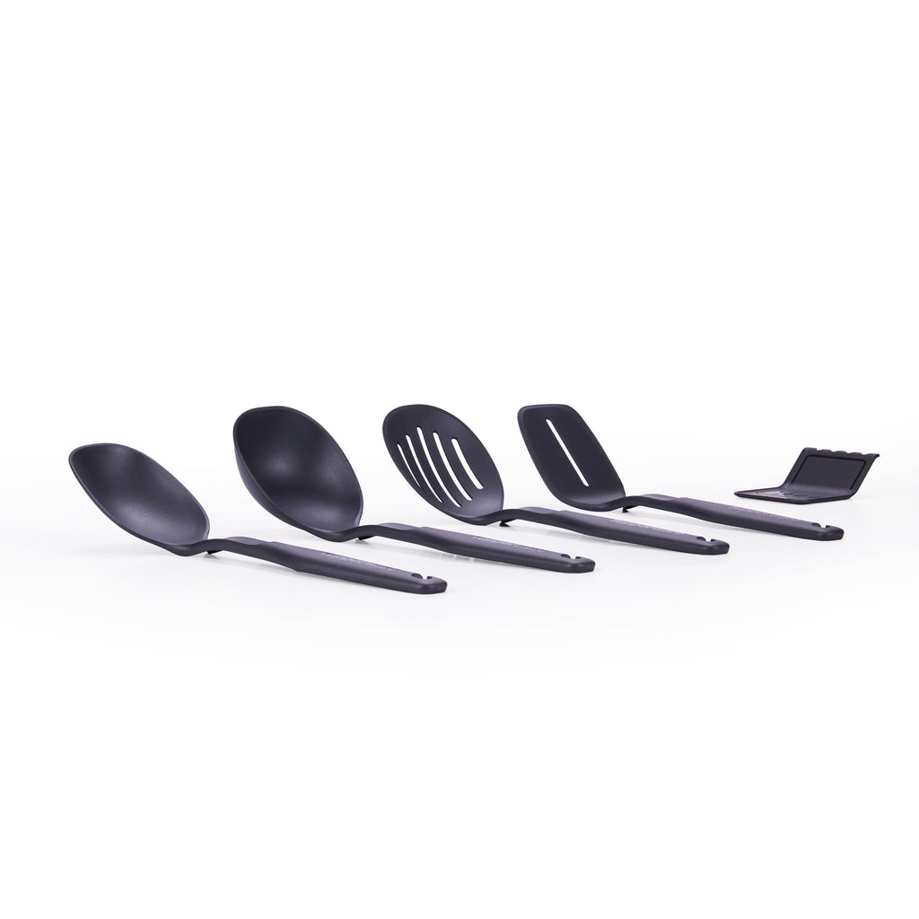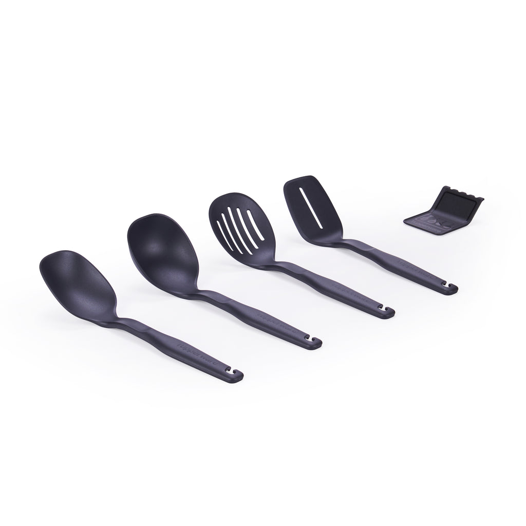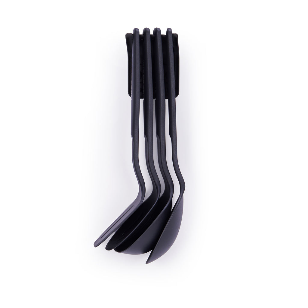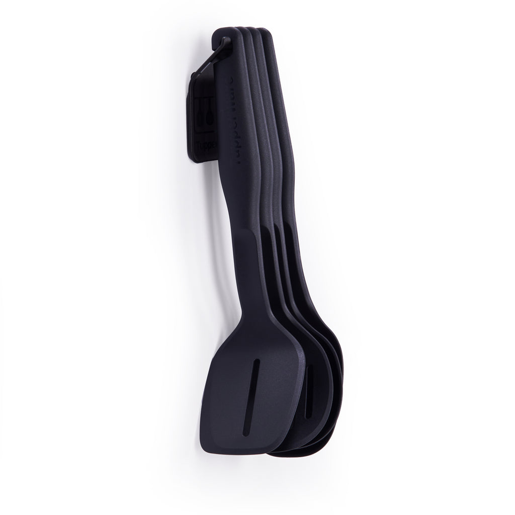 Explore the versatility of Compact Kitchen Tools - a collection of 4 expertly designed tools that can be used for skimming, grabbing, flipping, scooping, and straining. Includes a custom-made holder for convenient storage and organization when not in use. Whether hung on the wall or kept in a drawer, these versatile tools are ideal for any kitchen, providing a professional and efficient cooking experience.