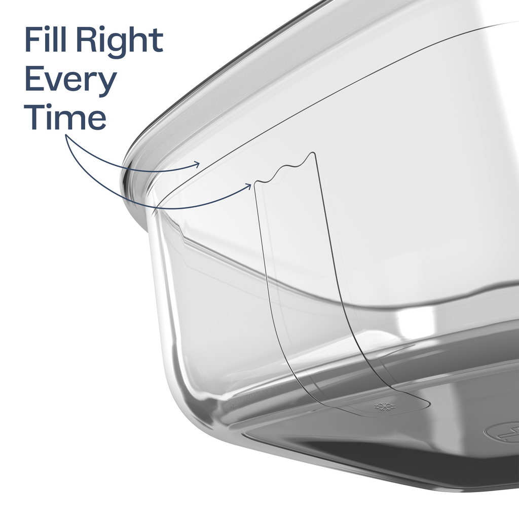 The airtight, easy-press lid locks in freshness quickly, securely, and hassle-free. A built-in steam-release vent allows for splatter-free, even reheating in the microwave. Dual, easy-to-read fill lines help prevent overflows –use the straight line as the max-fill for everyday foods, and the wavy line when freezing liquids like soups or sauces to allow safe expansion.